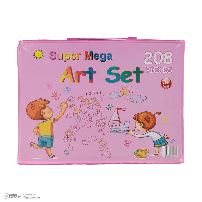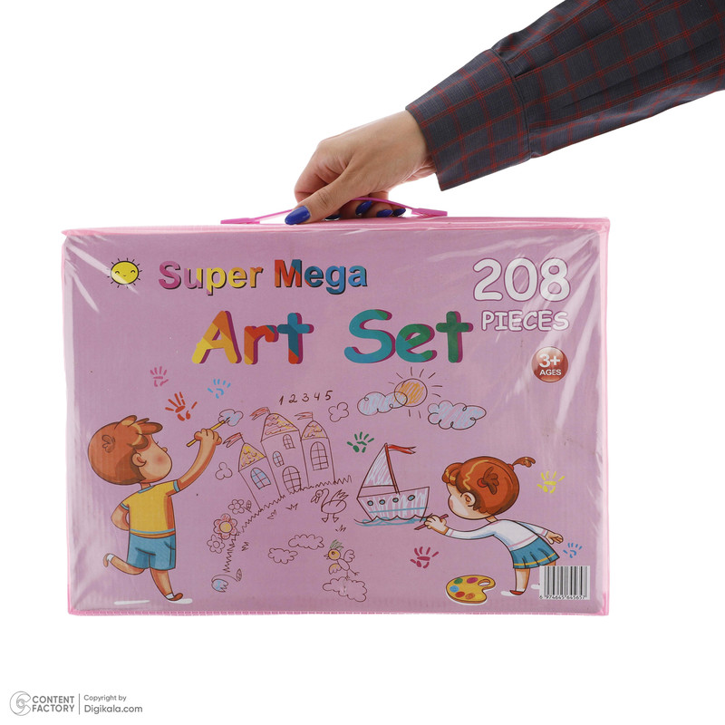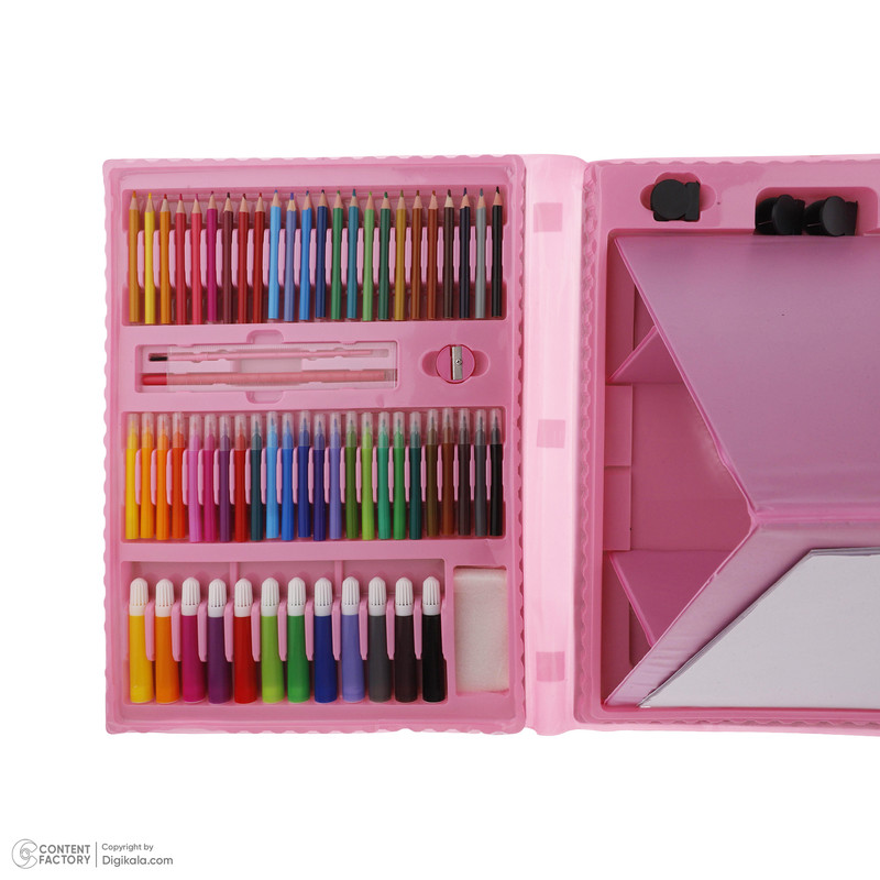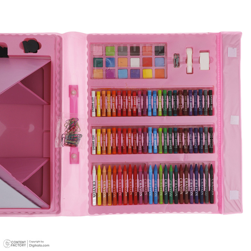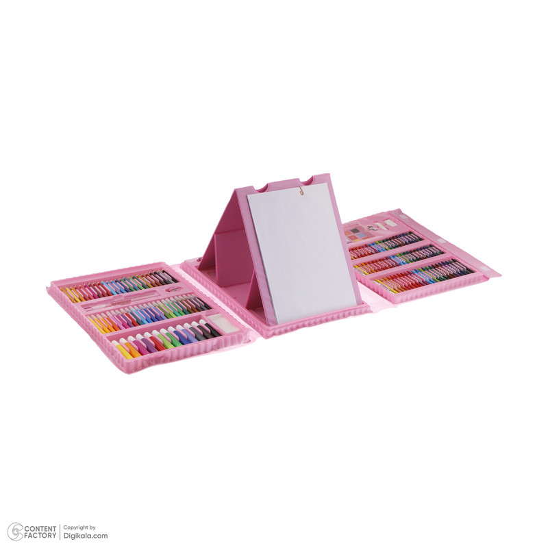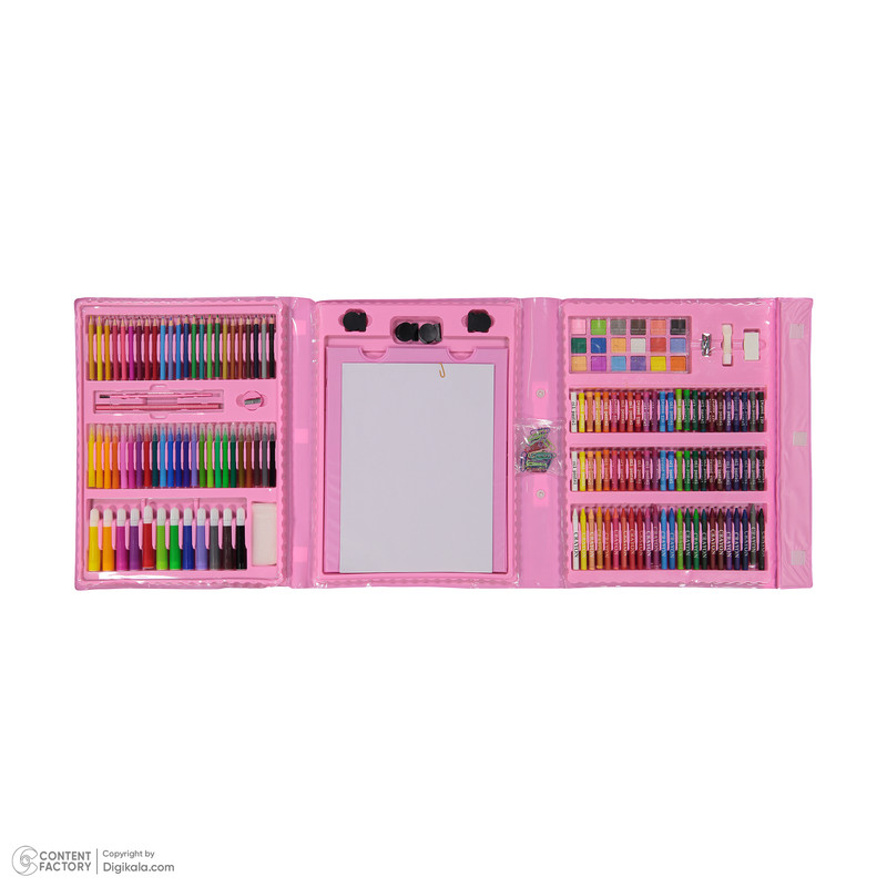 دارای 48 عدد ياستل - دارای 24 عدد مداد شمعی - دارای 24 عدد مداد رنگی - دارای 36 عدد ماژیک - دارای تراش - دارای 18 رنگ آبرنگ - دارای پاک کن - دارای گیره نگهدارنده کاغذ - دارای چسب - دارای خط کش قلمو و مداد مشکی - دارای کاغذ - دارای کیف حمل تاشو - دارای گیره نگهدارنده کاغذ